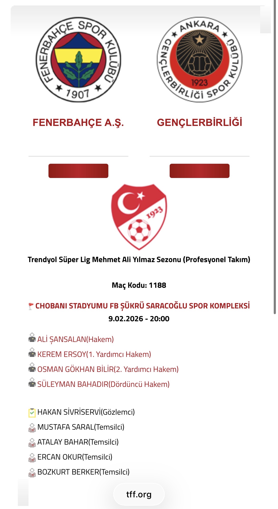 25/26 Trendyol Süper Lig 21. Hafta Fenerbahçe A.Ş. - Gençlerbirliği ![]()