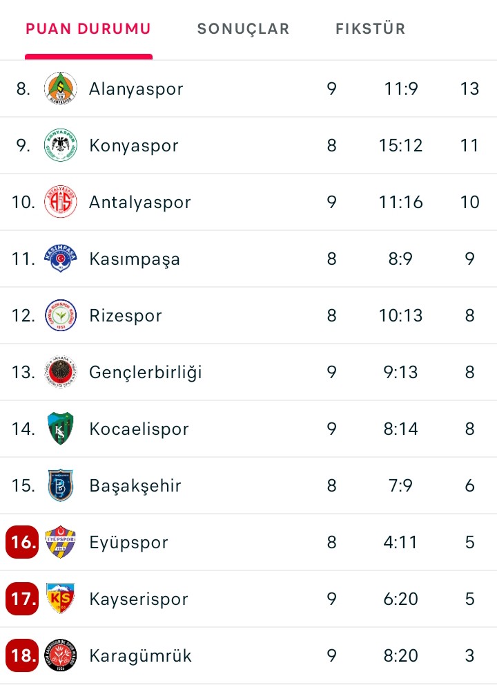 Eyüp Kasımpaşa’yı 2-0 yendi ve puanını 8’e yükseltti; Kasımpaşa ise 9 puanda kaldı. 8 maçta 6 puan alan Başakşehir düşme hattında… Çarşamba günü 8 puanlı Rize ile deplasmanda erteleme maçını oynayacak. Bu maçın sonucuna göre düşme hattı puanı Rize yenerse 6, berabere biterse 7, Başakşehir yenerse 8 olabilir. Beşiktaş’tan deplasmanda aldığımız 3 puan ilaç gibi oldu. ![]()