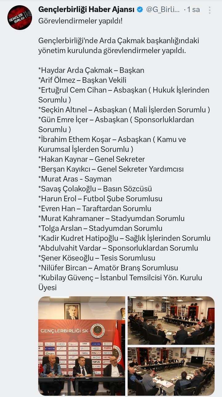 Yönetimde görev bölümü yapılmış. Hayırlı uğurlu olsun. Çok ağır bir yükün altına girdiler. Mali açıdan sıkıntımız büyük. Kolaylıklar ve başarılar diliyorum.